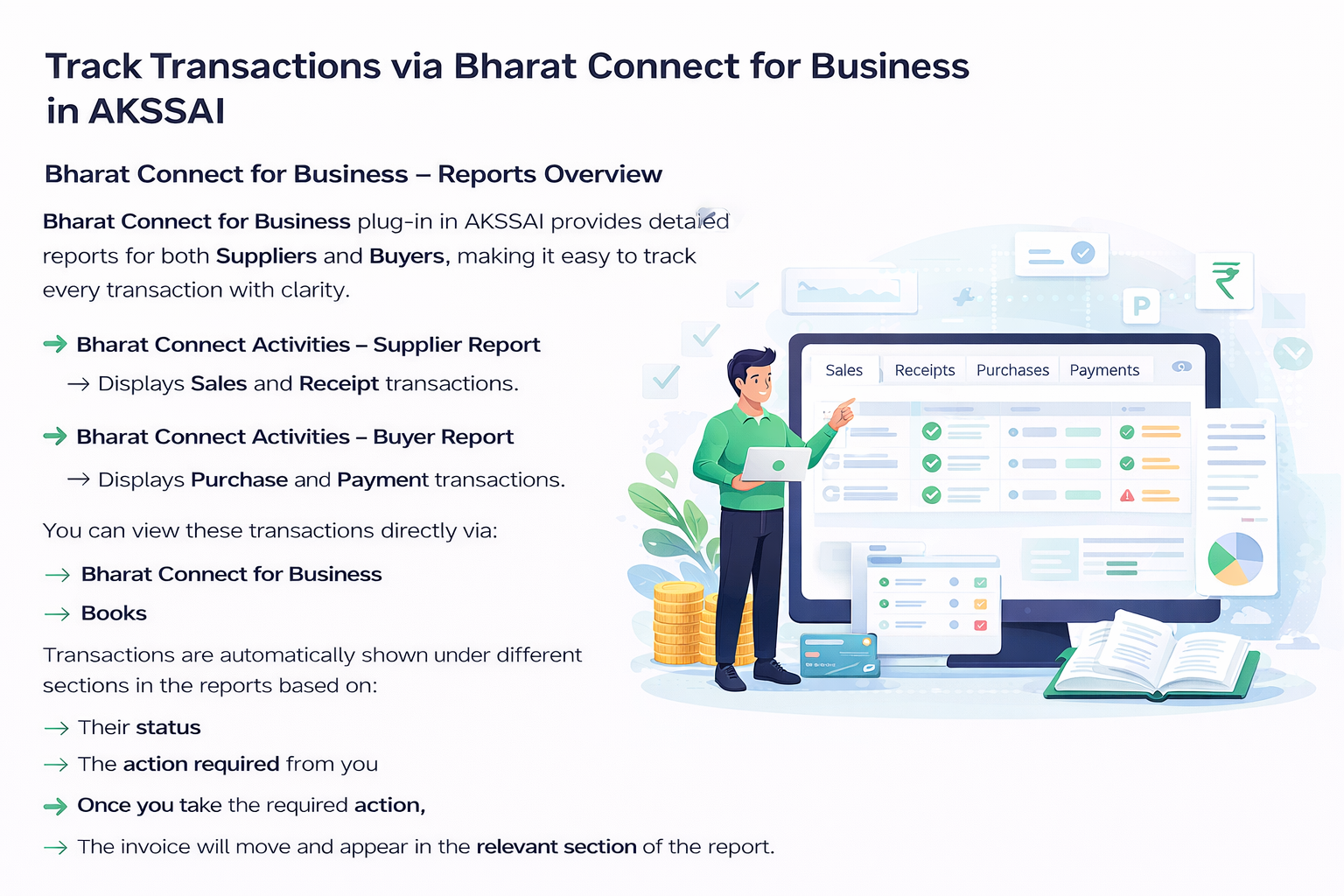 You can view and manage these transactions via Bharat Connect for Business as well as directly within books.
